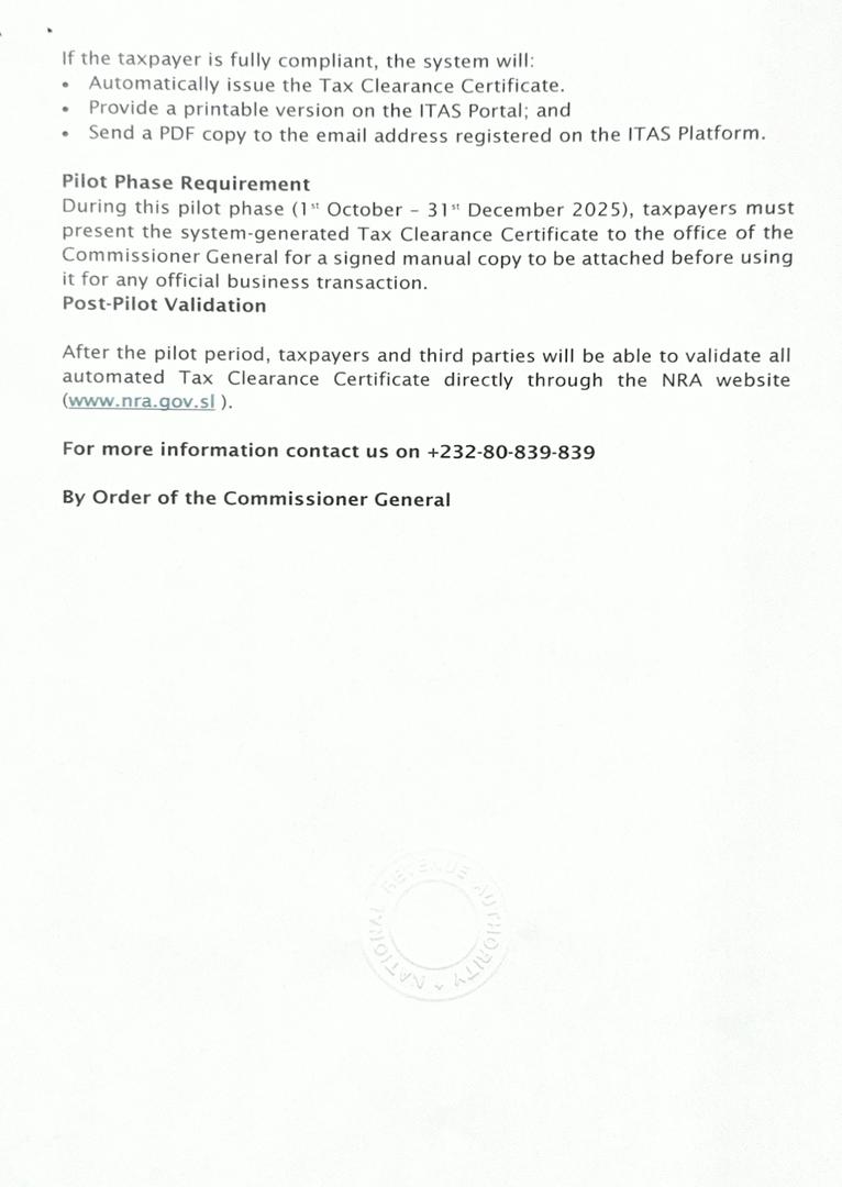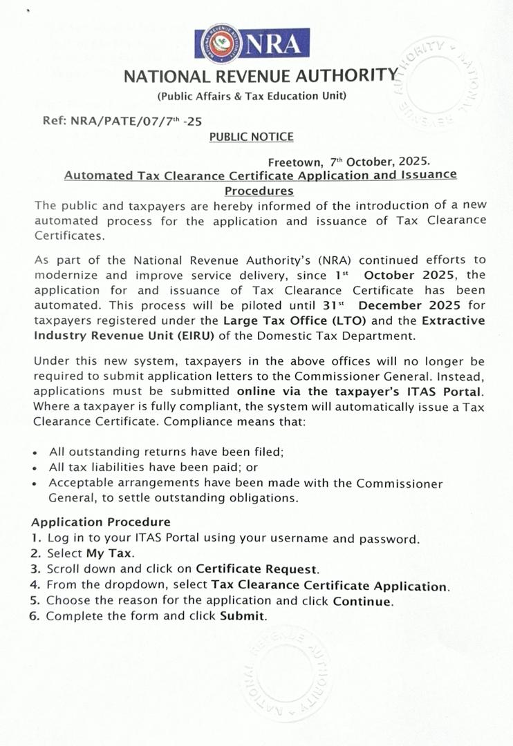 Public Notices Official Announcements Automated Tax Clearance Certificate Application and Issuance Procedures Date: 7th October 2025 Issued by: National Revenue Authority (Public Affairs & Tax Education Unit) View Page 1 View Page 2
